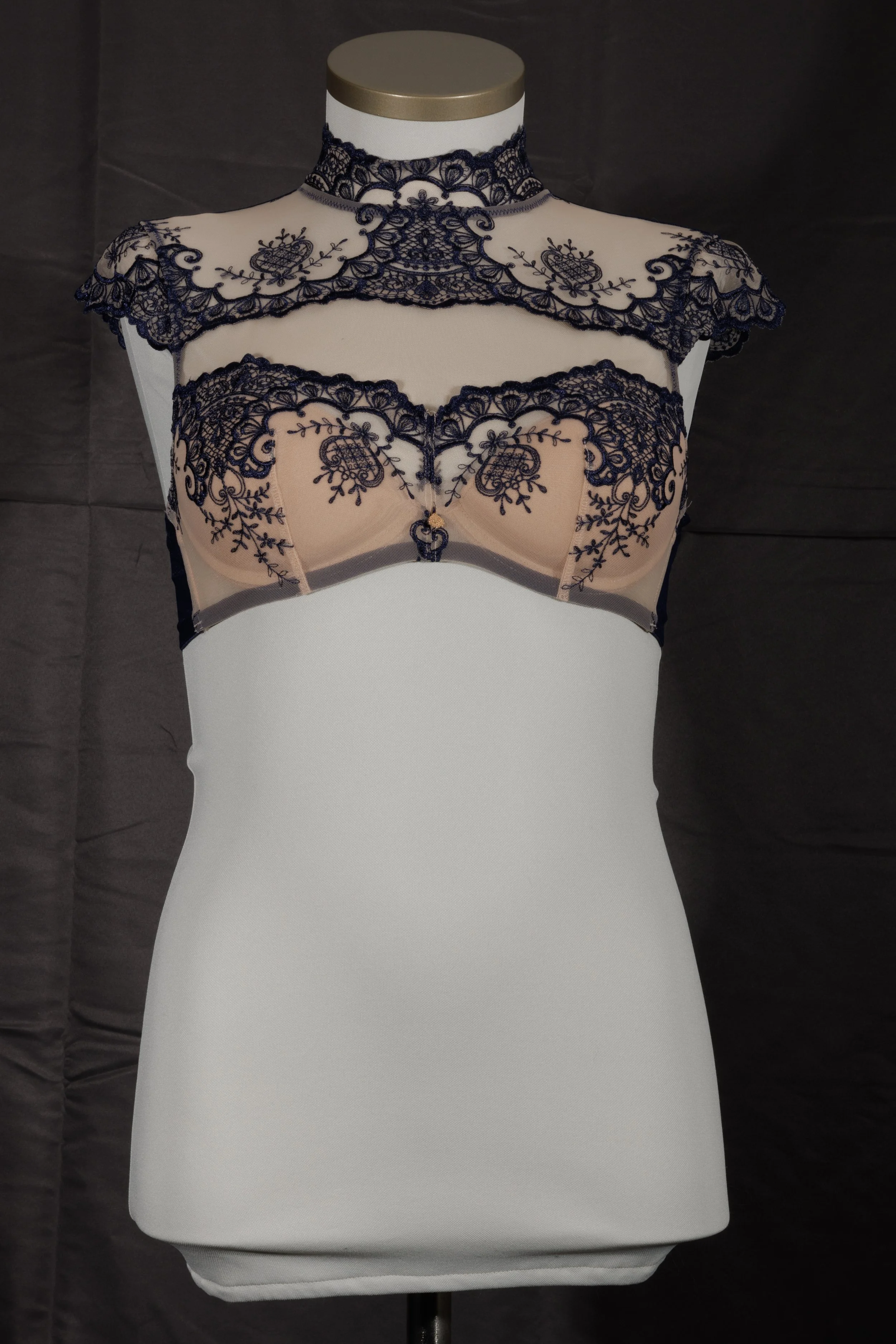 Spitzen-Bustier mit hohem Kragen, Beldona, beige und dunkelblau, Grösse S